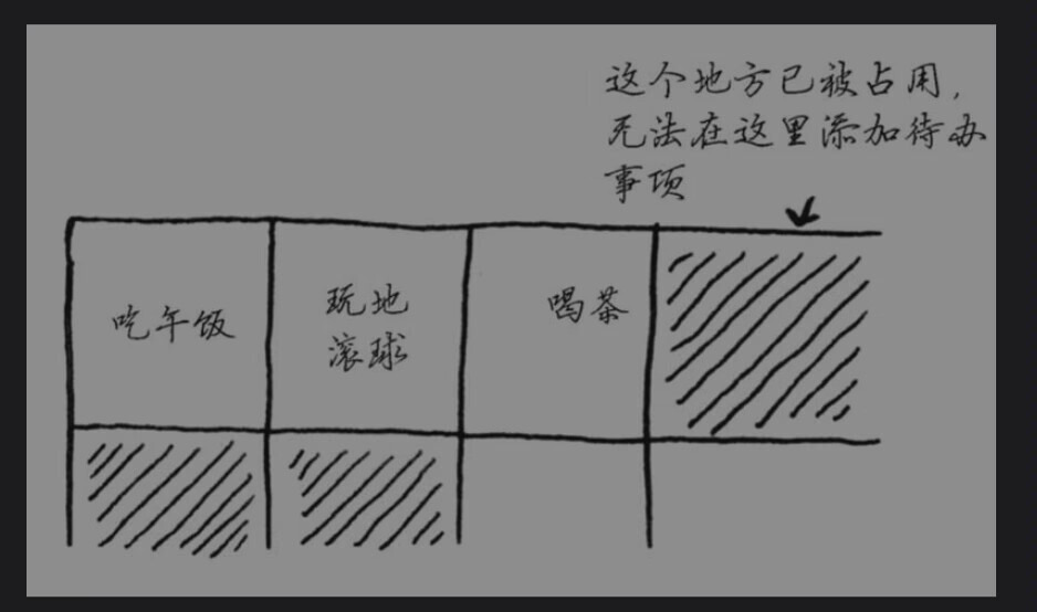 ❑ 待办事项超过10个后,你还得转移。因此,这种权宜措施虽然不错,但绝非完美的解决方案。对于这种问题,可使用链表来解决。