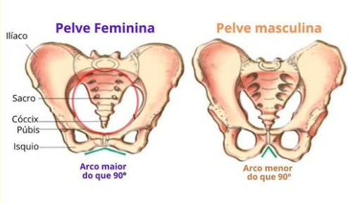 Pelve feminina são mais arredondadas e pelves masculinas são mais quadradas.