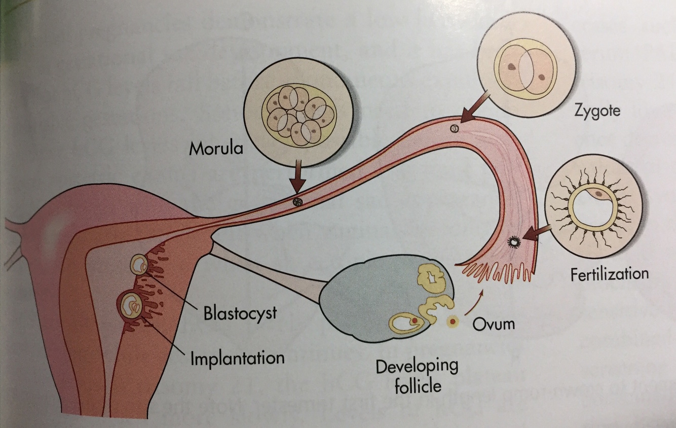 Fertilization occurs at distal end of fallopian tube, days 1-2. Fertilized conceptus is now referred to as a zygote which undergoes rapid cellular division to form the 16-cell morula, days 3-4. Further cell proliferation bring the morula to the blastocyst stage, days 4-5. Implantation happens within 12 days post fertilization into the uterine decidua Figure 47-1 p.1065