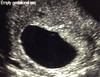 4-5 weeks; Embryo seen at 4 weeks as echogenic curved structure adjacent to yolk sac (chp 45 p.p.)