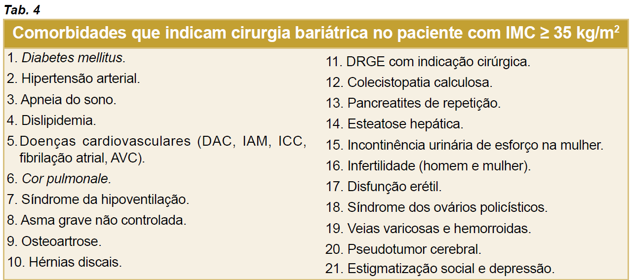 IMC ≥ 40, IMC ≥ 35 + pelo menos 1 das comorbidades listadas, falha no tratamento clínico após 2 anos e obesidade grave instalada há mais de 5 anos.