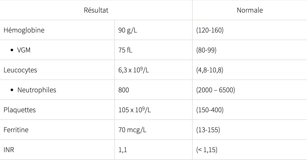 Vous voyez une patiente qui a subi une dérivation bilio-pancréatique il y a 5 ans. Elle est non observante à ses vitamines. Elle consulte, car elle a une dyspnée d’effort plus importante depuis quelques mois. Elle a aussi une perte de sensibilité des 2 mains et des 2 pieds.
