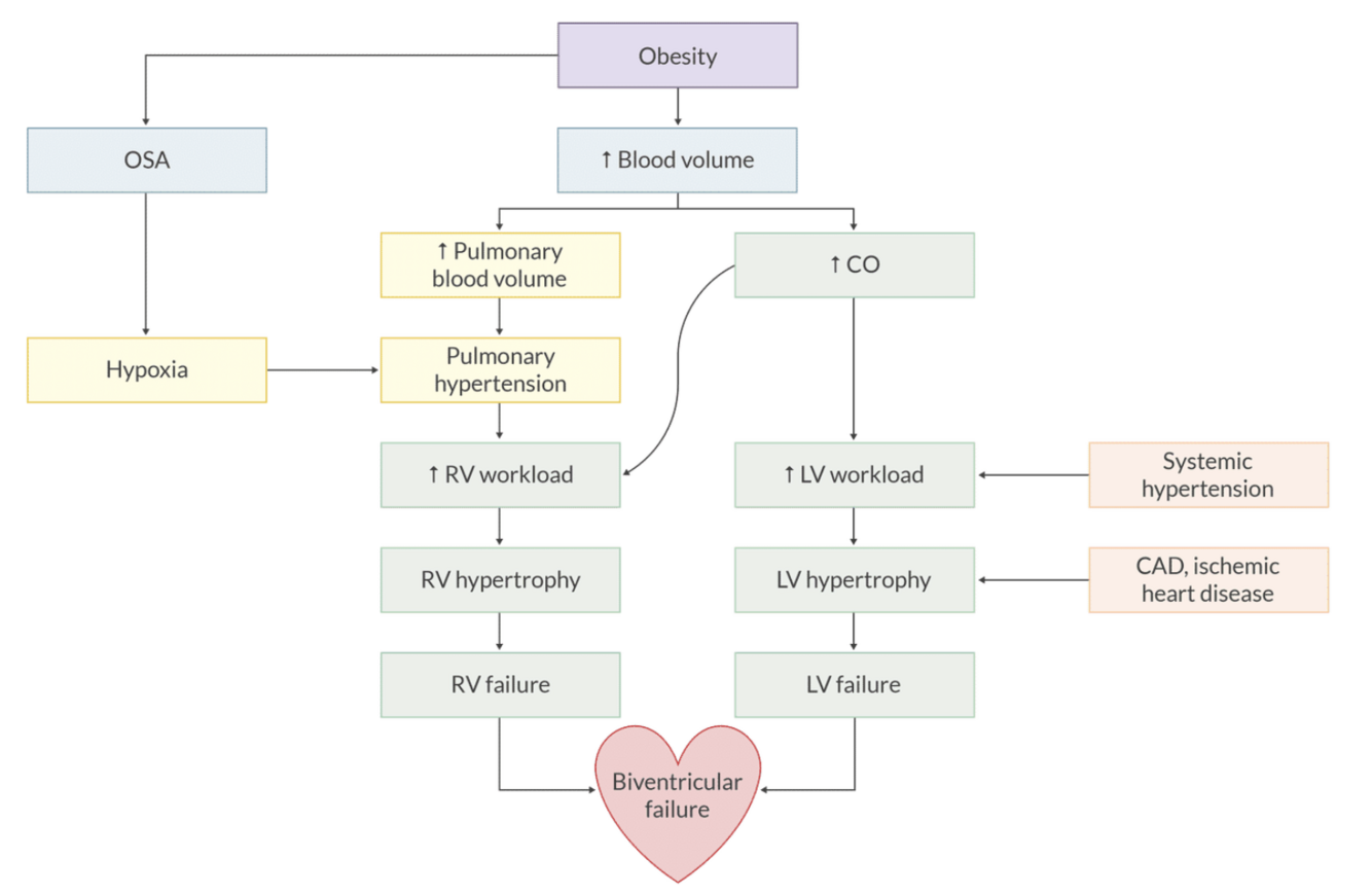 dysrhythmias (caused by fatty infiltration of conduction system, myocardial hypertrophy, hypoxemia, hypercarbia, obesity hypoventilation syndrome, ischemic heart disease