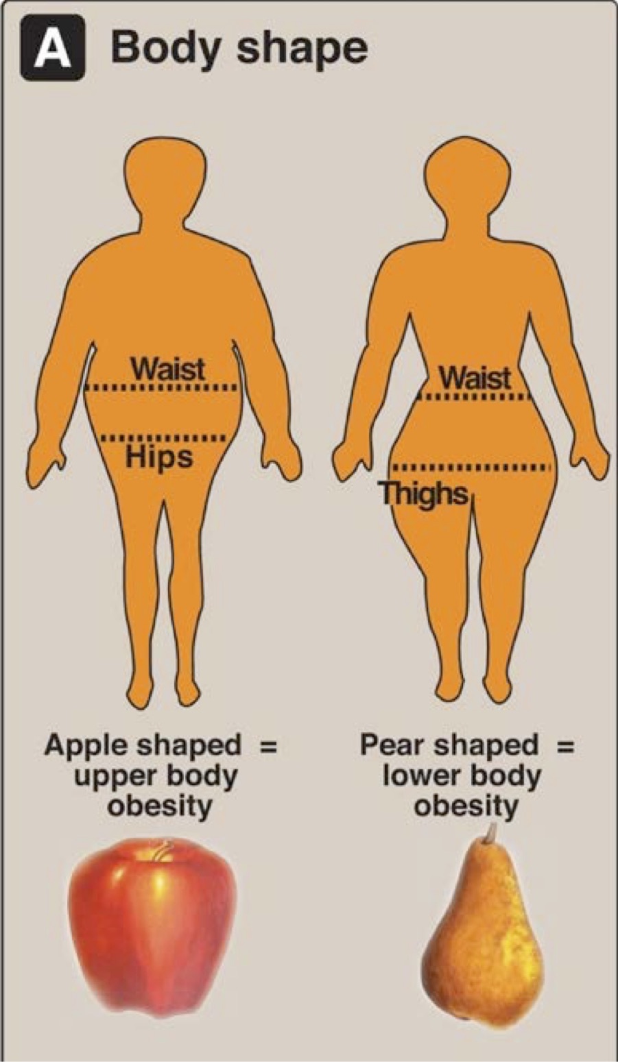 Apple shape: increased fat deposition in the abdominal area.