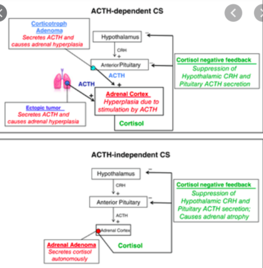 Cushing’s disease = hypercortisolism caused by an adrenocorticotropic hormone (ACTH) secreting pituitary adenoma (responsible for 80% cases).
