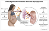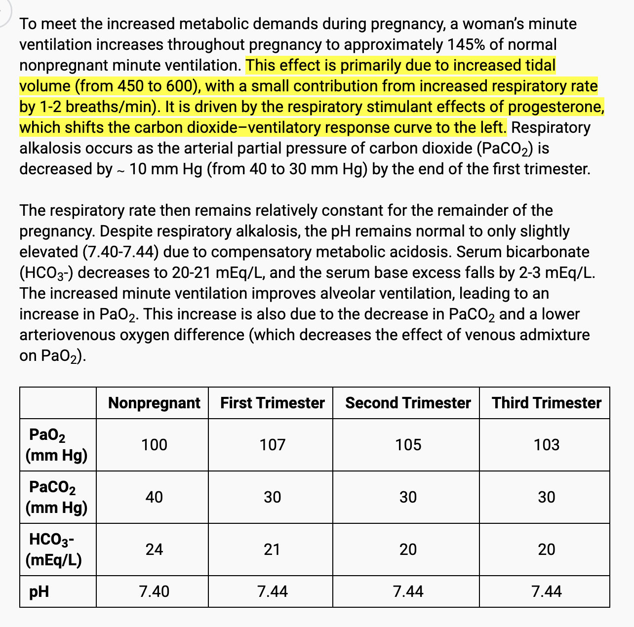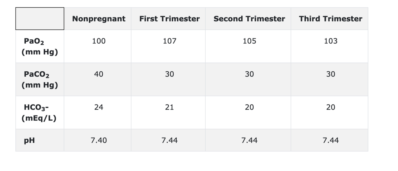 The respiratory rate then remains relatively constant for the remainder of the pregnancy. Despite respiratory alkalosis, the pH remains normal to only slightly elevated (7.40-7.44) due to compensatory metabolic acidosis. Serum bicarbonate (HCO3-) decreases to 20-21 mEq/L, and the serum base excess falls by 2-3 mEq/L. The increased minute ventilation improves alveolar ventilation, leading to an increase in PaO2. This increase is also due to the decrease in PaCO2 and a lower arteriovenous oxygen difference (which decreases the effect of venous admixture on PaO2).