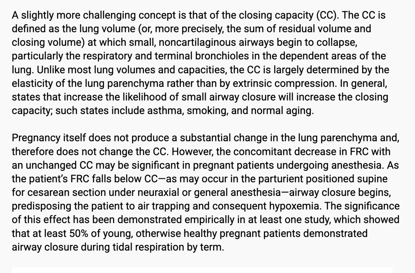The decreased FRC and RV that also occur as the uterus expands during pregnancy render pregnant women more susceptible to hypoxemia in the supine or lithotomy position and during the induction of general anesthesia.