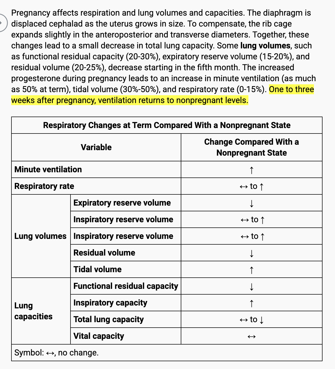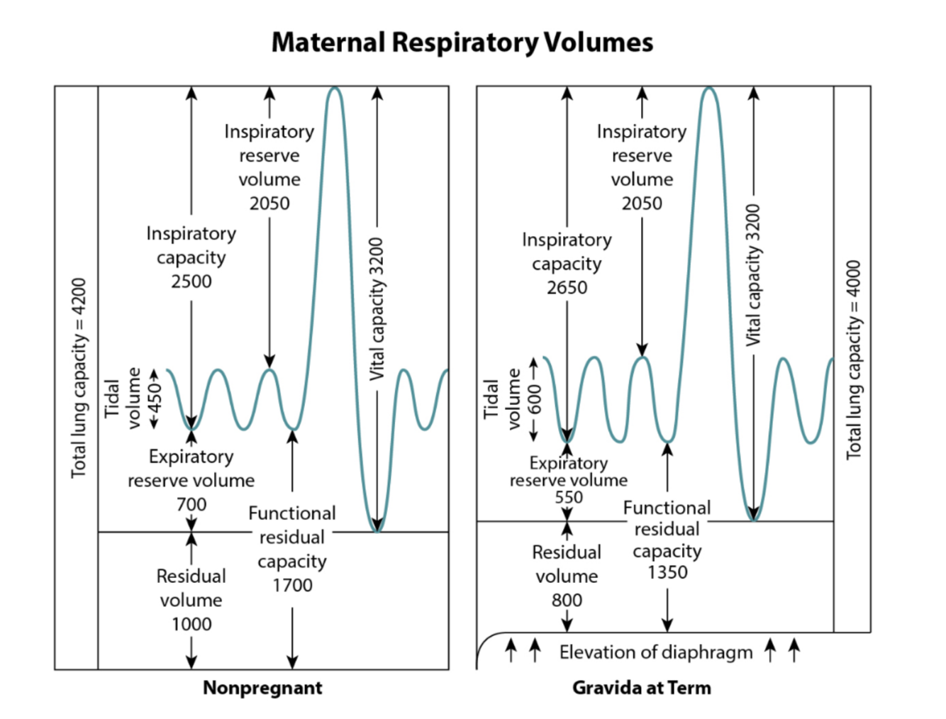 The increased progesterone during pregnancy leads to an increase in minute ventilation (as much as 50% at term), tidal volume (30%-50%), and respiratory rate (0%-15%). One to three weeks after pregnancy, ventilation returns to the nonpregnant levels.