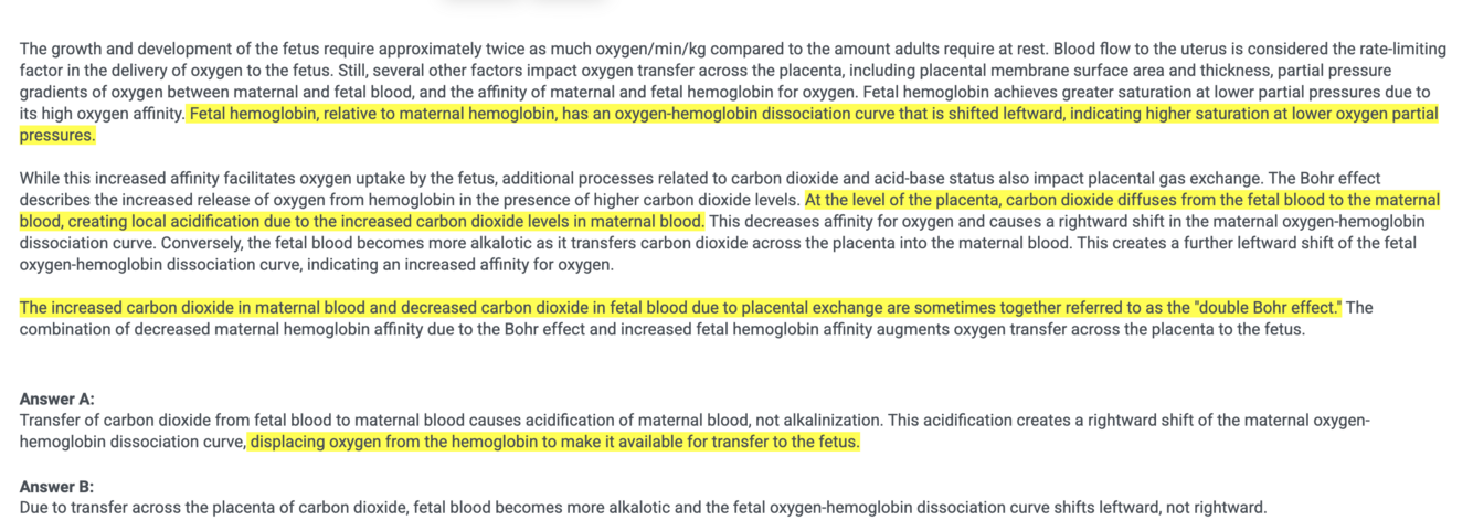 TrueLearn Insight: The P50 of maternal hemoglobin during pregnancy increases from 26.8 mm Hg in the prepregnant state, to 30 mm Hg. This results in a rightward shift of the maternal oxyhemoglobin dissociation curve. The fetal oxyhemoglobin dissociation curve sits to the left of the normal adult and maternal dissociation curves. The P50 of fetal hemoglobin is 19-21 mm Hg. The increase in this gradient between P50 values of the mother and fetus facilitates oxygen unloading from maternal hemoglobin to fetal hemoglobin.