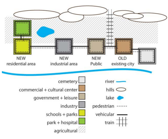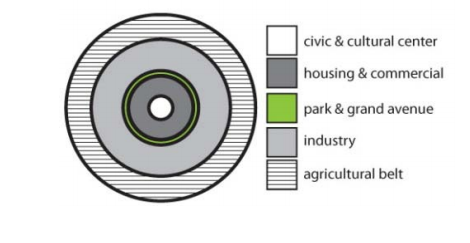 Concept published by Tony Garnier in 1917, this plan was the first to emphasize the idea of zoning. It was a model industrial city that suggested the separation of work from housing, including separate zones for residential, public, industrial, and agricultural use, linked by separate circulation paths for vehicles and pedestrians.