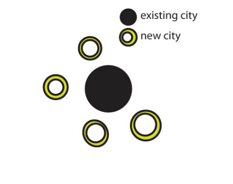 This concept is the extension of the idea that new communities should be built away from the crowding and ugliness of existing cities. Designed to be autonomous centers surrounded by a greenbelt, these communities never became independent because they lacked employment centers and depended on nearby cities for jobs.