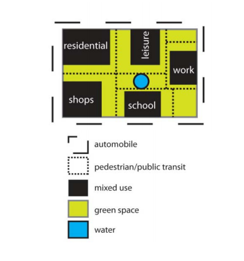 This concept attempted to counter the undesirable aspects of city development: sprawl, car dependence, housing segregation, single use development. It promotes the connection of neighborhoods intended for mixed use, as well as the connection of neighborhoods and towns to regional patterns of bicycle, public transportation, and pedestrian systems. The concept encourages buildings to be integrated with their surroundings and supports the preservation and reuse of historic structures.