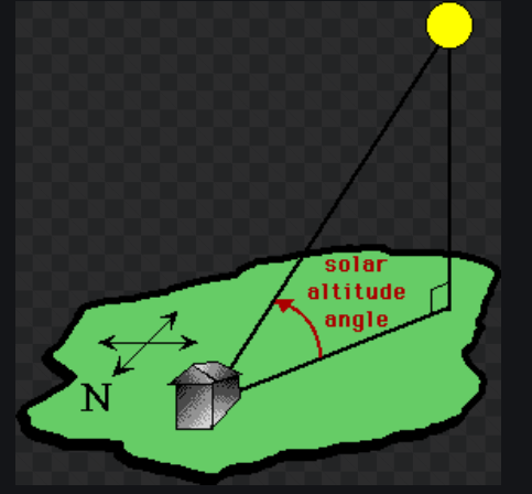 Solar altitude is the measure of the angle of the sun relative to the Earth’s horizon. This angle varies depending on time of day and time of year; it also varies according to the observer’s location on the Earth.