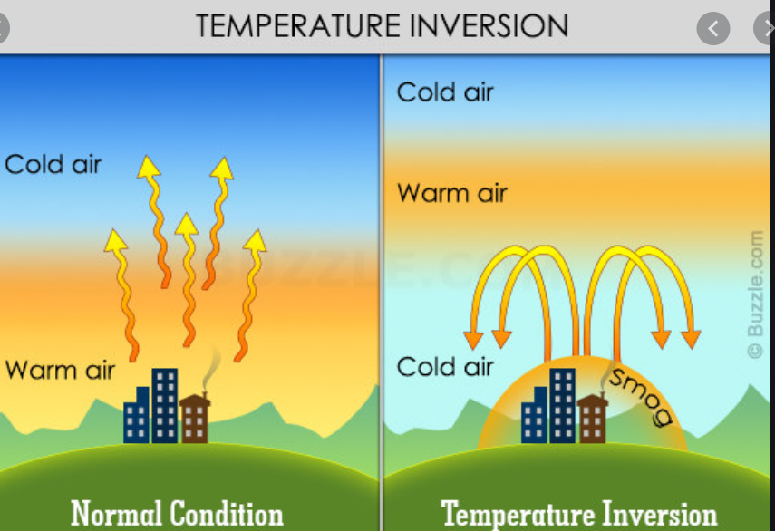 Air temperature at ground level is lower than at higher elevations, causing heavy, cold, trapped air below to release pollutants.
