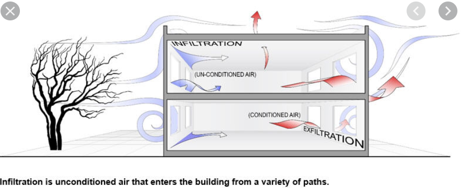 Accidental exterior air that enters a building (through cracks and openings in the building envelope) due to construction quality, wind pressure, and temperature difference.