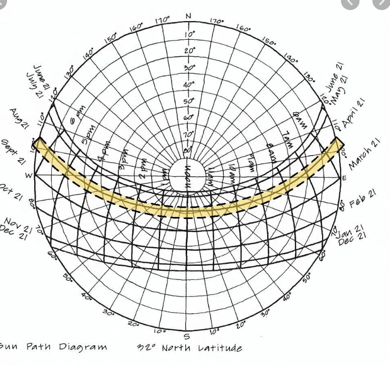 A graph of the sun’s ecliptic through the sky throughout the year at a particular latitude. It is a plot of the azimuth versus altitude throughout the day for the period between the winter and summer solstices.