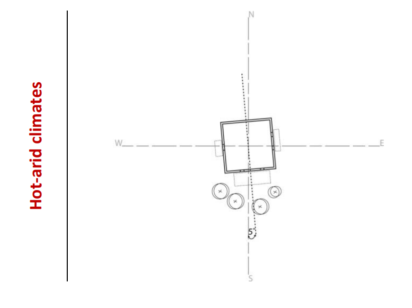 Hot and dry: Minimize sun exposure, use small windows and shading, utilize thermal mass for temperature swings, and cluster buildings together to aid in shading.