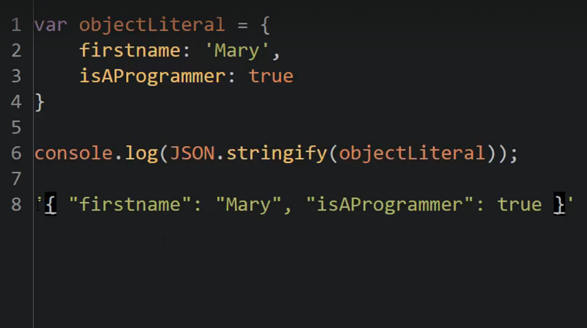 JSON.stringify will convert a JS Object to a JSON string. In the image below, line 6 results in line 8.