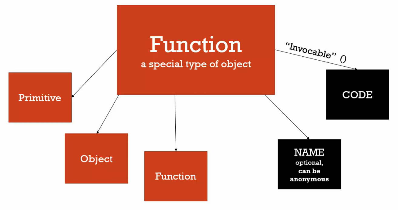 A function is actually just an object, but it’s a special object. So, in addition to the properties and methods that a normal object can have, it also has name and code values attached to it. Importantly, the code value is invokable.