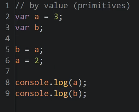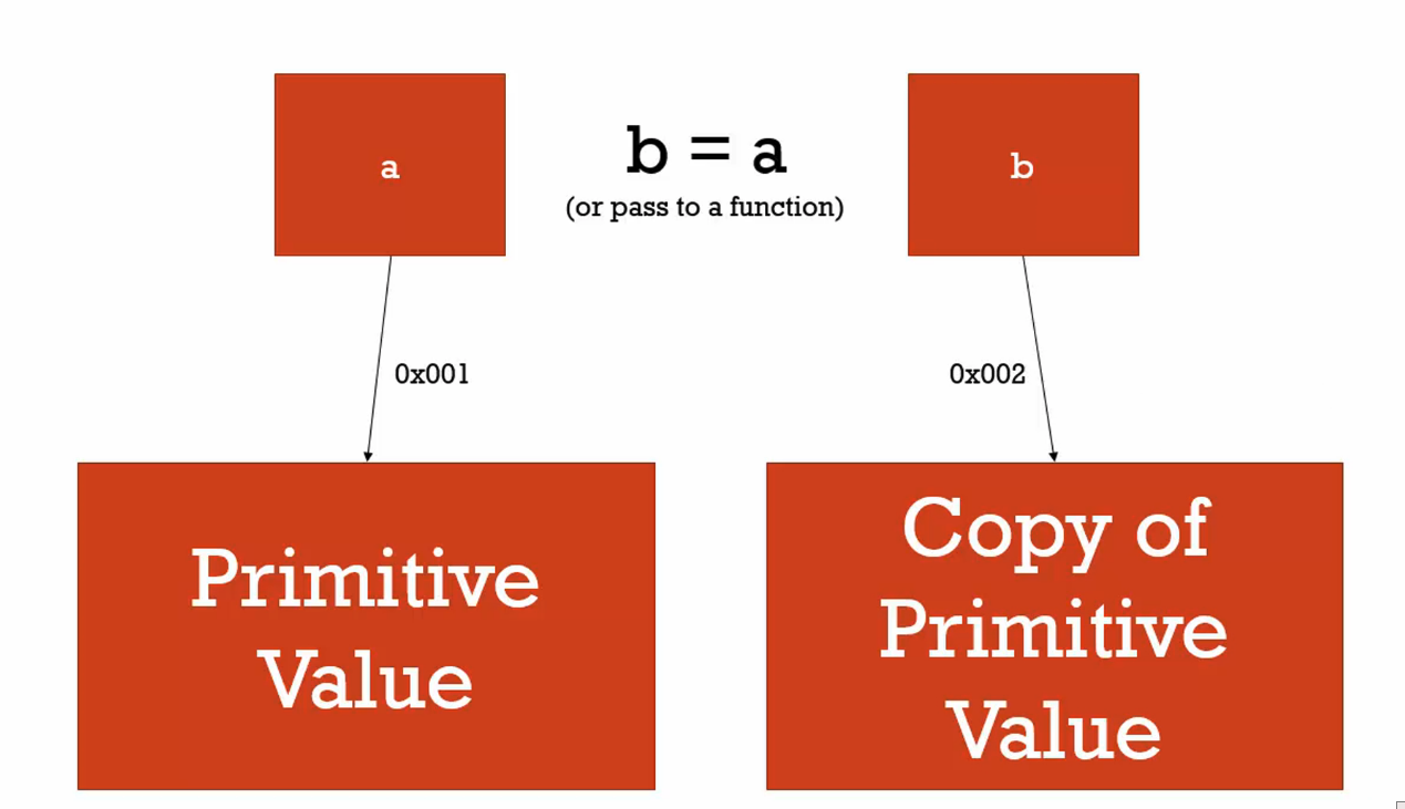 Variables store primitive values by value, which means that each variable points to its own copy of the value. So, if a variable is set equal to another variable or passed to a function, it will then be pointing to a new copy of that primitive value. These copies are not linked to the original value, so if one changes it does not affect the other value.