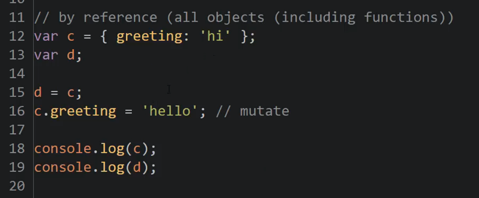 You see the same result for both logs because they’re both pointing to the same place in memory. The mutation on line 16 is changing the value which is pointed to by both variables - it wouldn’t matter if d was mutated instead of c.