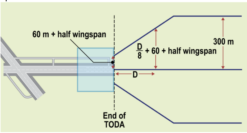 60m + half wing span + 1/8 of distance from end of TODA up to max half-width of 300m
