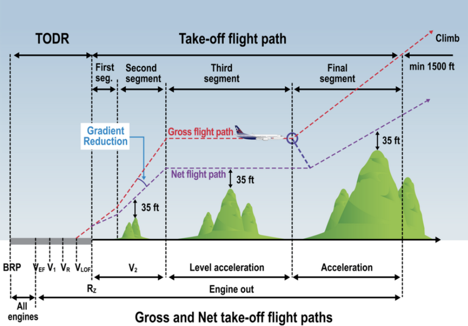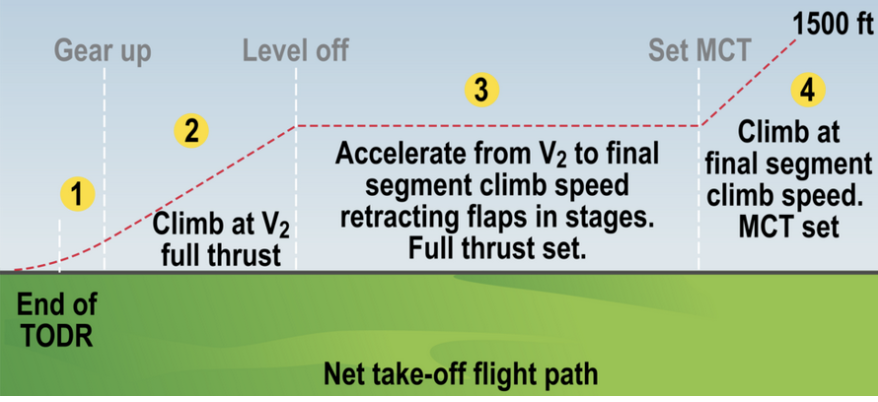 First segment lasts from the end of TODR, where a/c is at 50ft, to the point it enters cloud and is flown on all engines with the gear assumed to be up