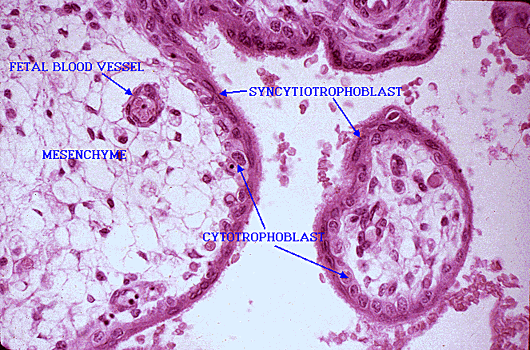 (Thinning of trophoblasts, less interstitium, more blood vessels)