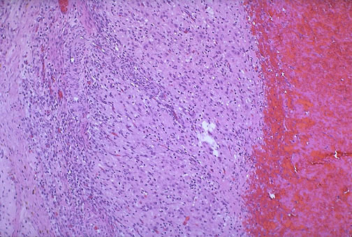 (Notice the granulosa cells to the left with blood to the right)