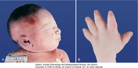(Potter sequence - flattened nose and ears, contractures of hands and feet)