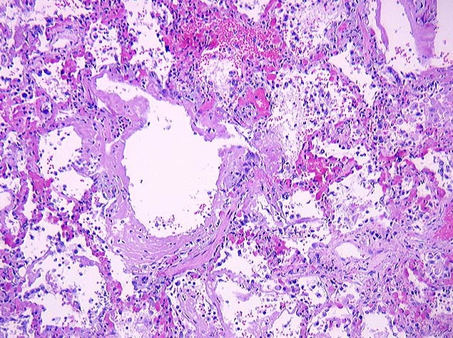 (Causes pulmonary spasms, HTN, and RHF triggering diffuse alveolar damage, sometimes with a second round of DIC and hemorrhage)