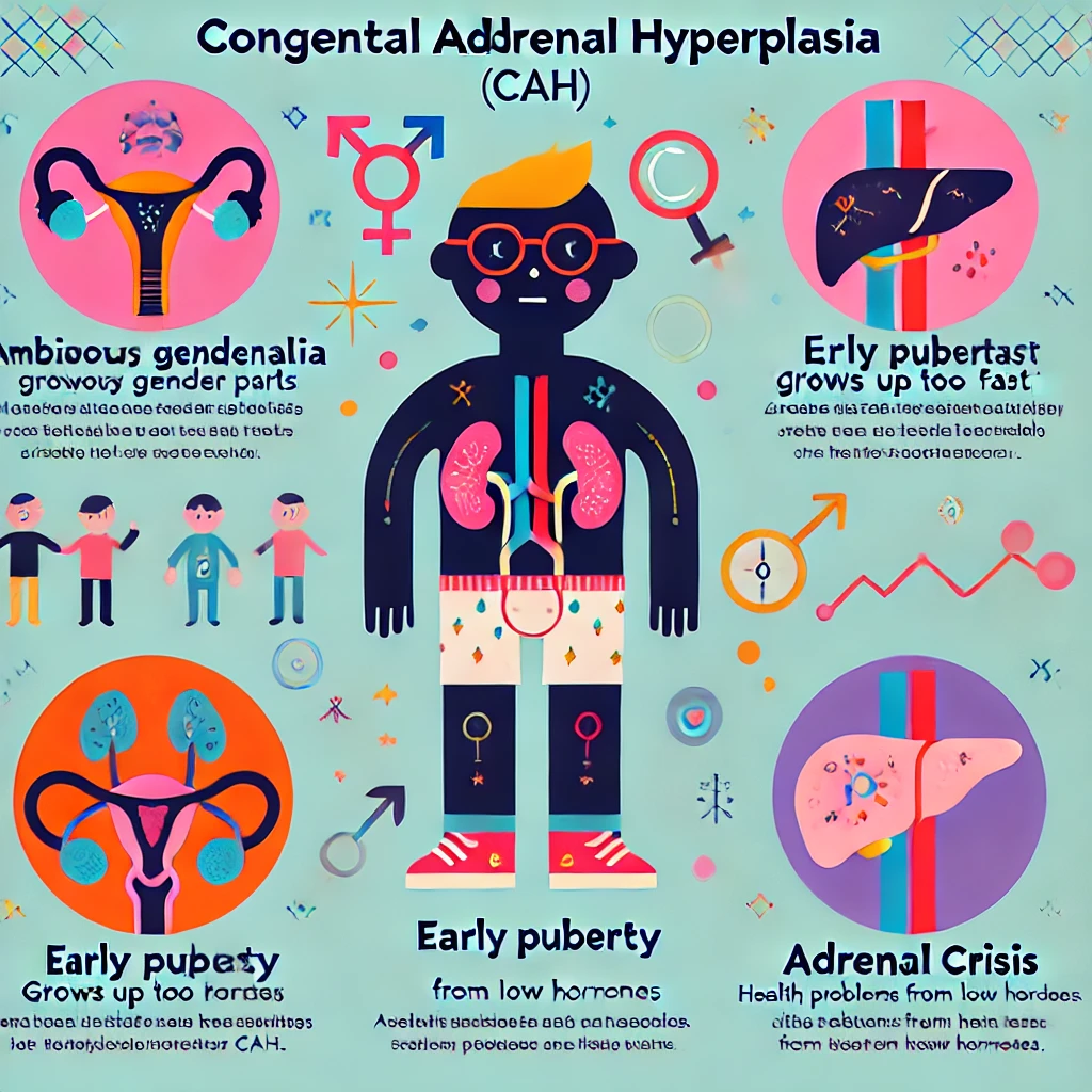 Features include salt-losing crisis in infancy, masculinized external genitalia in females, hirsutism, acne, and irregular cycles in adults. Treatment involves cortisone replacement.