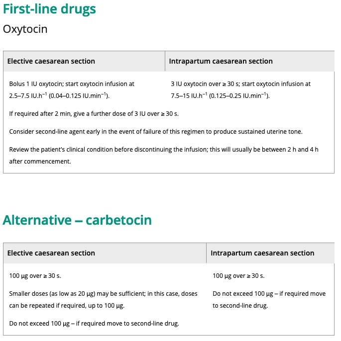 Bolus 1 IU oxytocin; start oxytocin infusion at 2.5–7.5IU.h (0.04–0.125 IU.min)