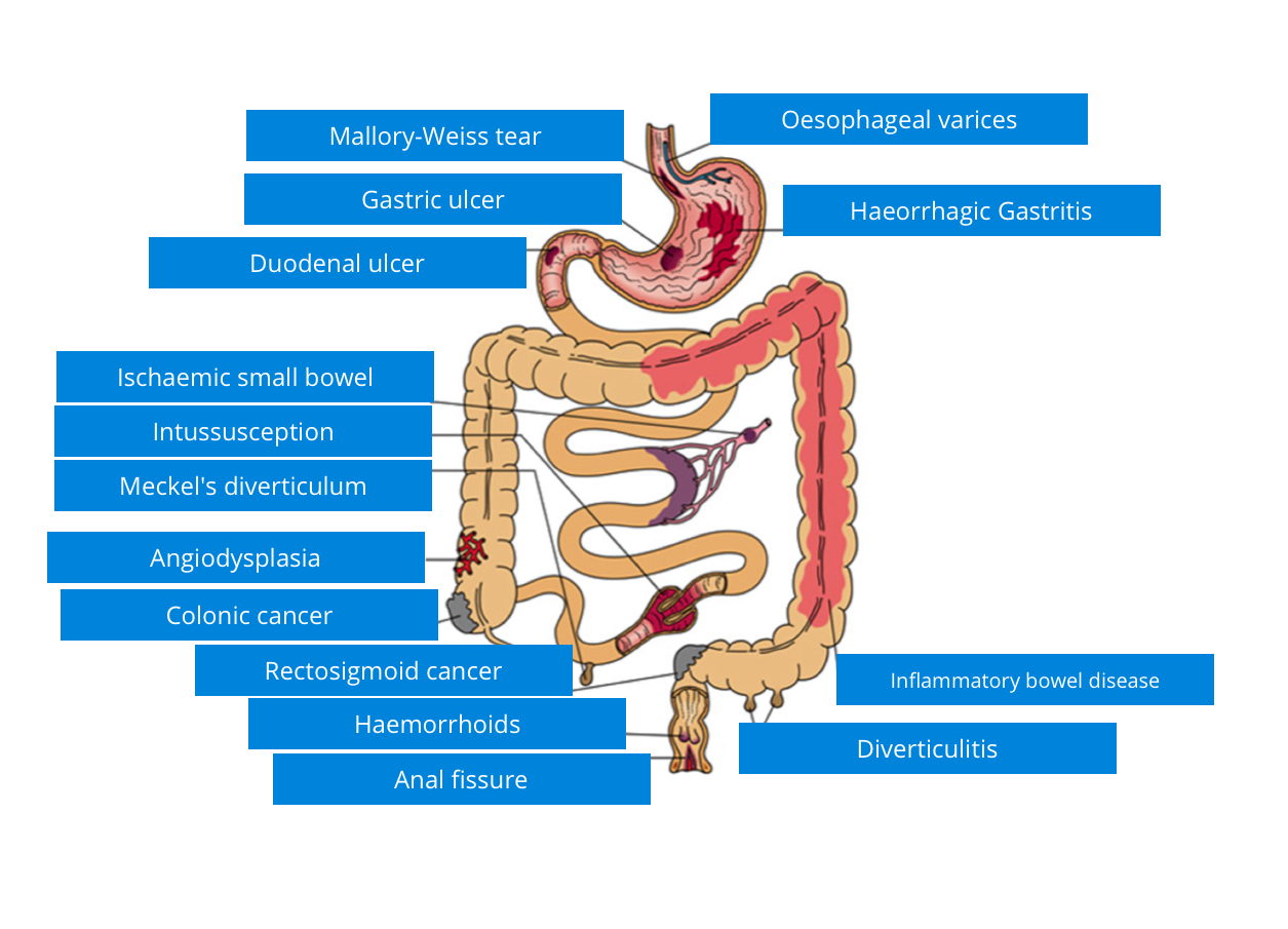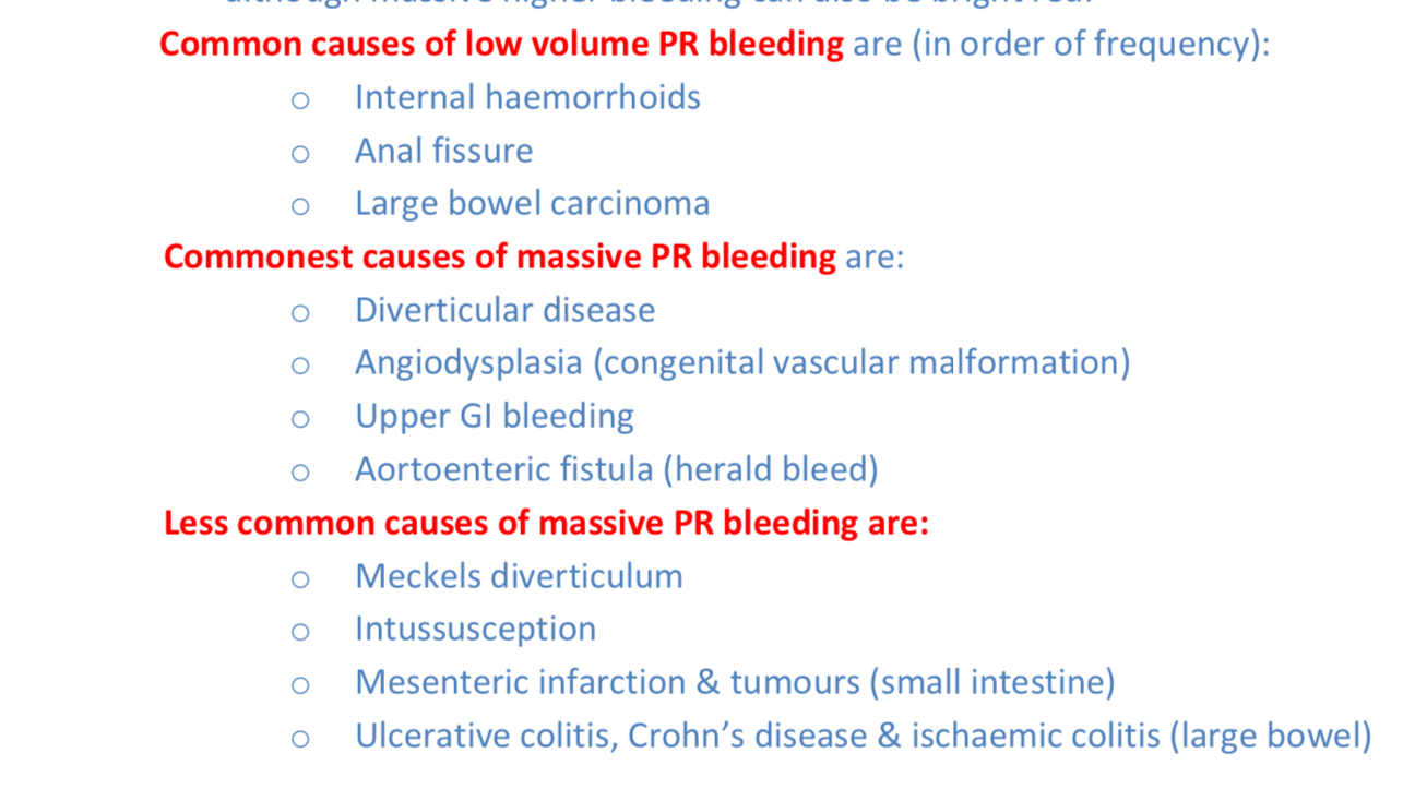 What are the causes of low and high PR bleeding ? Most commonenst and. Least commonest