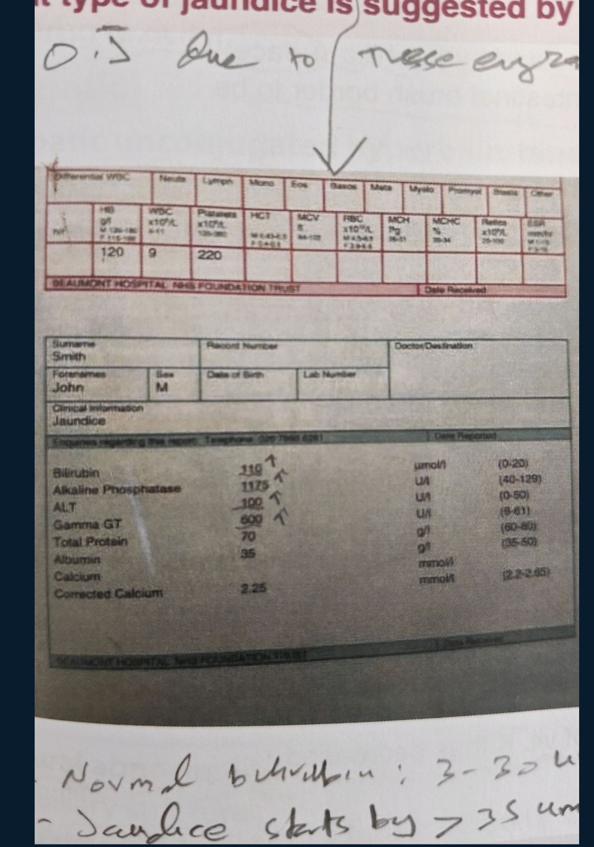 what type of jaundice is suggested by the blood results and urine analysis?