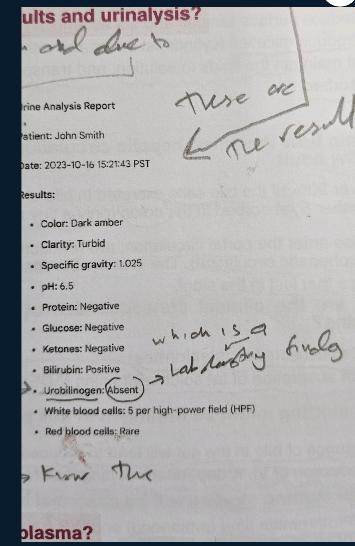 You are on-call for general surgery and are asked by the Emergency Department to see a 45-year-old female describes dark urine, and on examination she is jaundiced and has mild epigastric tenderness, Blood tests and patient. She complains of a 2-day history of epigastric pain, nausea and vomiting. On direct questioning she urinalysis results are available