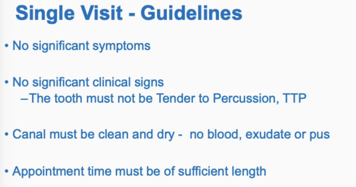 *the presence of necrotic pulp and PA radiolucency on radiographs are not contraindications to a single visit