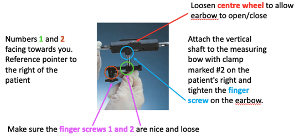 attach the vertical shaft to the measuring bow with clamp marked 2 on the pt right and tighten with the finger screw on earbow