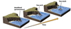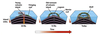 Volcano over hot spot-> extinct-> erodes to sea level -> submerges and warps downwards and top flattens (flat-topped seamounts/ guyots)