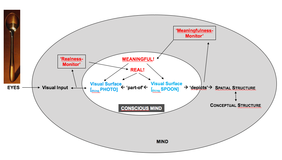 Wanneer je iets ziet leg je een verbinding tussen: 1. Wat je perceptuele systeem (je zintuigen) je vertelt + 2. wat je ‘weet’. Wanneer we X zien dan: vormen we een mentale representatie van X en hangen daar bepaalde tags aan. –> De aandacht wordt gericht omdat we iets zien en dat ‘zien’ gebeurt grotendeels in onze geest. 1. Ik zie X 2. X bestaat echt 3. X is ‘out there’ het is niet een plaatje ervan