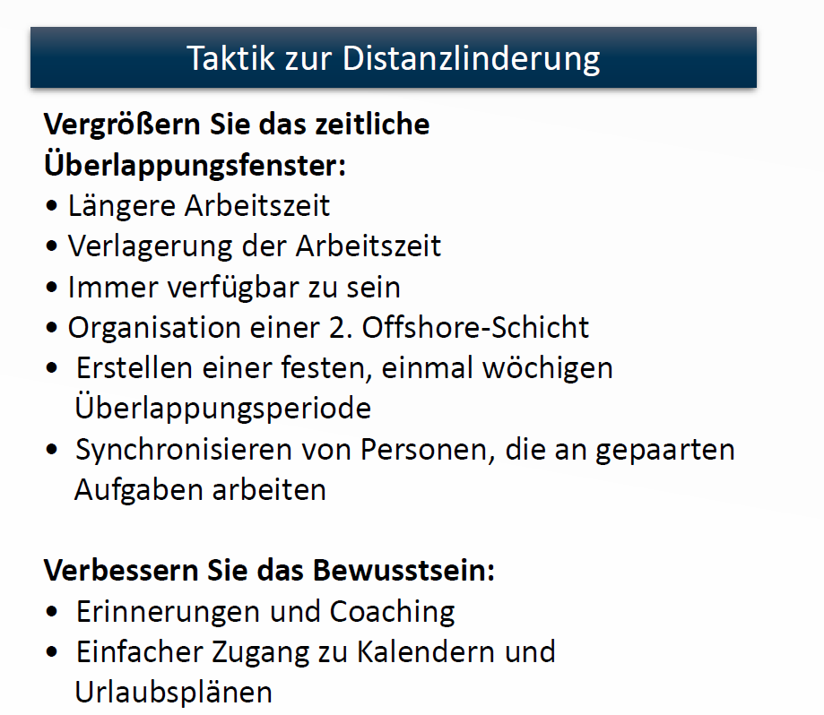 Welche Taktiken existiern zur Linderung geographischer Distanz und zeitlichen Unterschieden?