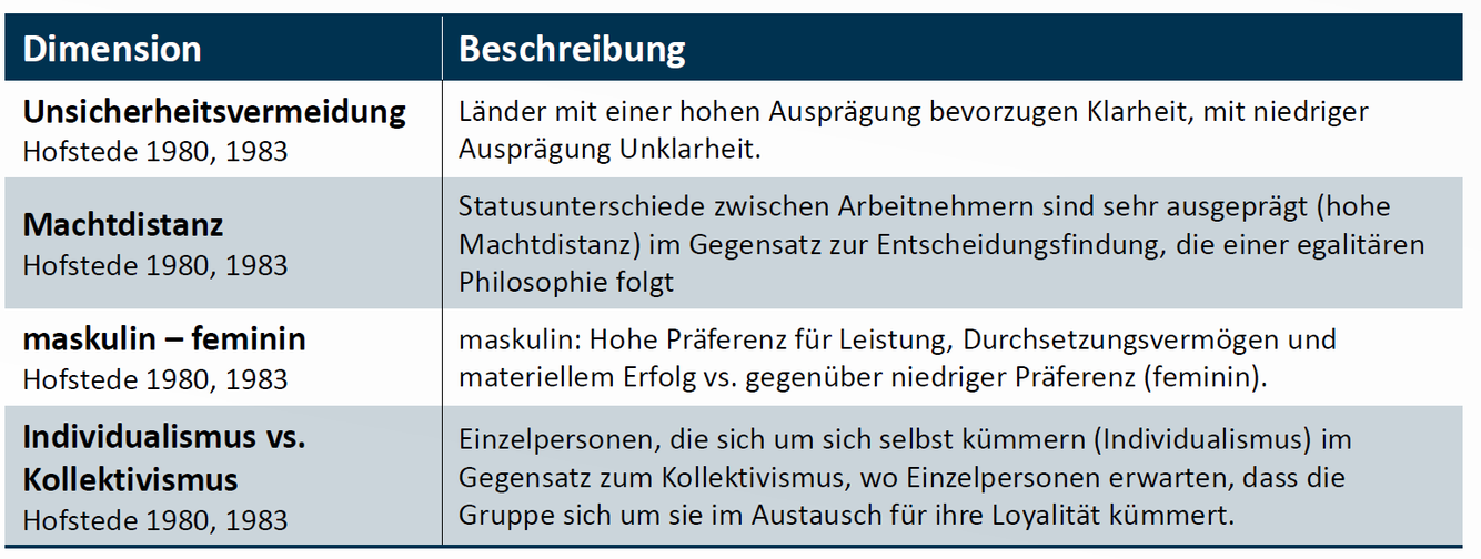 Nenne und erläutere die 4 Dimensionen zur Bewertung nationaler Kulturwerte nach Hofstede