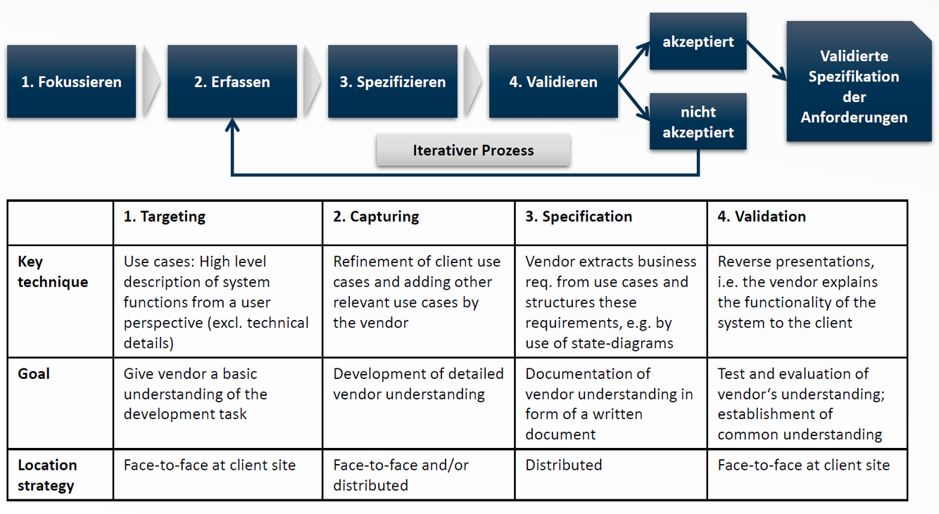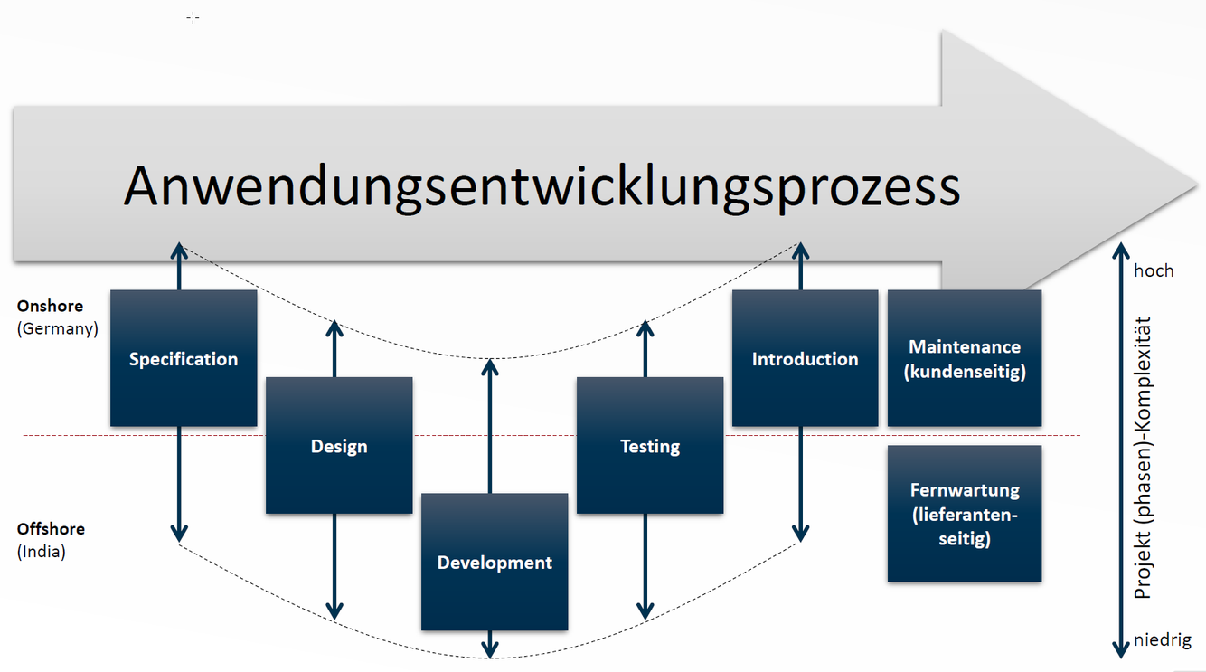 Ordne die Projektphasen einer Anwendungsentwiklung hinsichtlich ihrer On- und Offshore-Verhältnisse und ihrer zeitlichen Abfolge ein