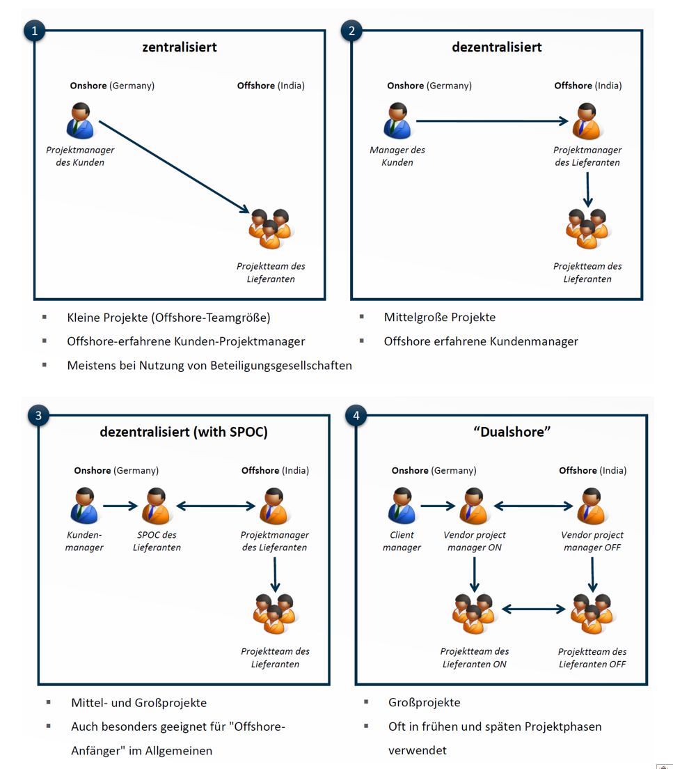 Nenne und beschreibe die 4 Client-Vendor-Zusammenarbeiten in IT-Offshoring-Vereinbarungen