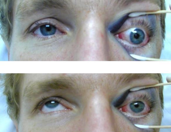 bedøv gerne med oxybuprokain (dog må der ikke dryppes hvis der er grundet mistanke om perforation -> øjenlæge.