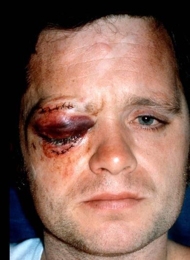 Terkel på 21 år, ramt i ansigt omkring højre øje af et jernrør vedet uheld. Han ser ud som på billedet.