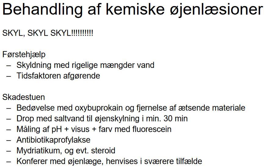 Behandling: som korneal abrasio: antibiotisk salve, evt pupildilation og blinkforhindrende klap. conchocain øjensalve giver effektiv smertelindring i op til 4 timer. denne gives ikke med hjem.