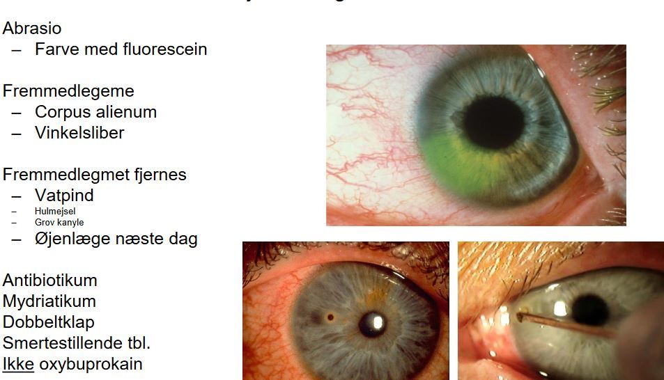 Behandling: som korneal abrasio: antibiotisk salve, evt pupildilation og blinkforhindrende klap. conchocain øjensalve giver effektiv smertelindring i op til 4 timer. denne gives ikke med hjem.