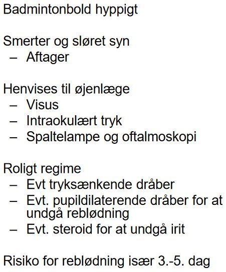 Stumpt traume mod øjet. Synligt blod i forreste øjenkammer.