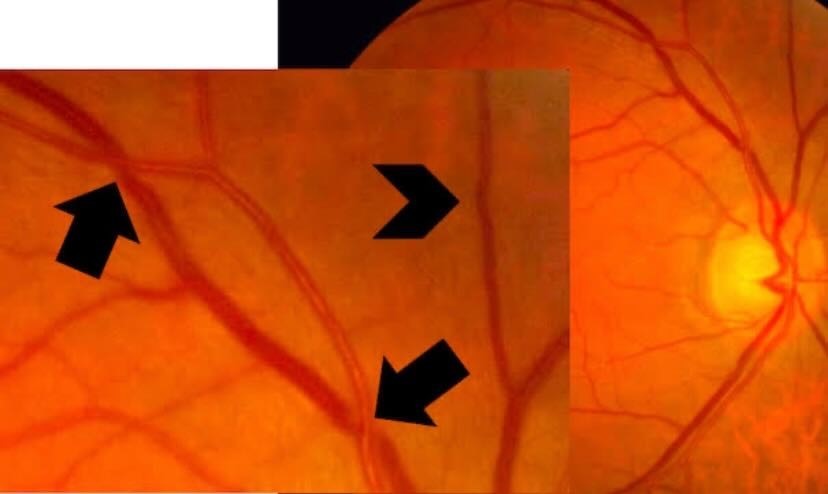 Vasos em fios de prata, cruzamento arteriovenoso patológico, curvamento alterado (HAS)